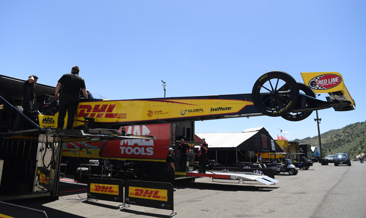 The Kalitta Motorsports/DHL crew roll Richie Crampton's Top Fuel dragster out of the transporter prior to Friday's opening qualifying sessions. Crampton enters the Denver race as the No. 8 seed in Top Fuel and is looking to solidify his spot in the Countdown.
