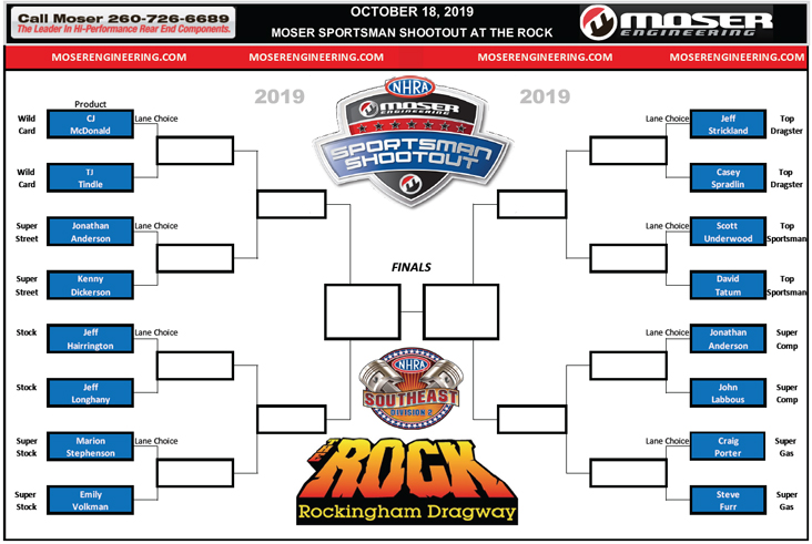 The NHRA Southeast Division Moser Sportsman Shootout will take to the track at Rockingham Dragway this Friday, Oct. 18, on opening day of the NHRA Lucas Oil Drag Racing Series and National Open event.