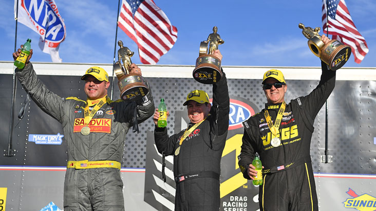 Event champions, from left, Matt Hagan, Billy Torrence, and Jeg Coughlin Jr. celebrated their victories.