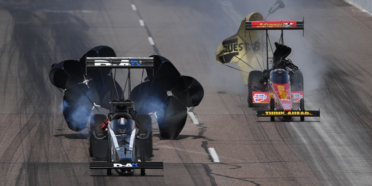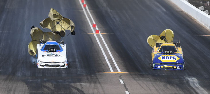 Rookie Jordan Vandergriff, left, defeated former world champ Brittany Force for his first career round win. Force’s Advance Auto Parts dragster backfired the supercharger at the finish line.