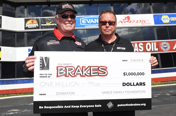 Legendary Pro Stock Motorcycle icon Terry Vance, right, donated $1 million dollars to B.R.A.K.E.S., the teen safe-driving organization founded by Doug Herbert.