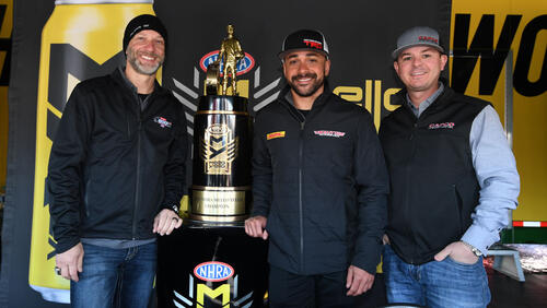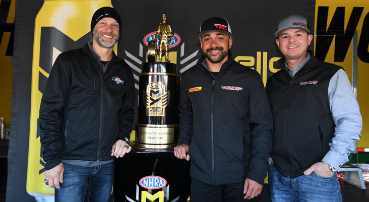 2018 Mello Yello champs, from left, Matt Smith, J.R. Todd, and Steve Torrence posed with the championship trophy prior to the Mello Yello autograph session.