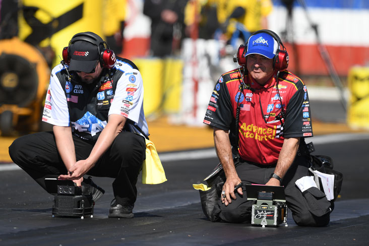John Force Racing track specialists checked the traction capabilities of the famed Pomona starting line before their cars made passes.