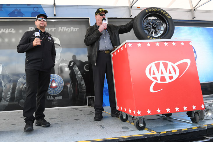 Robert Hight and NHRA's Alan Reinhart taught some fuel-racing basics to fans during the popular Nitro School segment in the pits.