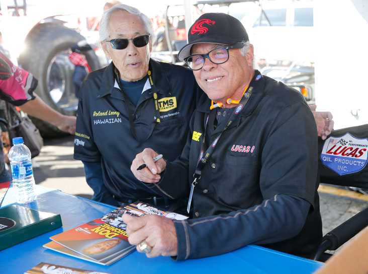 Drag racing legends Roland Leong, left, and Don "the Snake" Prudhomme signed autographs for fans.