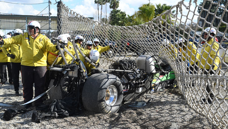 Top Alcohol Dragster racer James Stevens was involved in an on-track incident during the first round of eliminations. Stevens’ dragster went into the sand trap and net. Stevens was standing on his own and speaking with safety officials on site. He was transported to a local hospital for further evaluation.