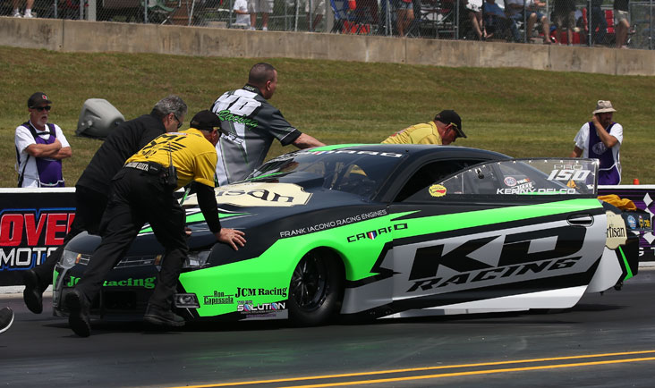 Pro Stock veteran Kenny Delco showed up with a flashy new paint scheme on his Camaro, but his first run was pre-empted after his parachutes came out after the burnout.