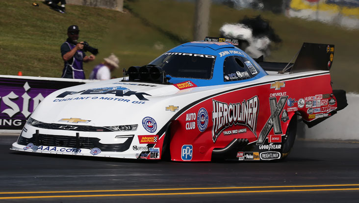 John Force is sporting Hurculiner livery on his Peak Chevy this weekend and grabbed the No. 2 spot in Q1 with a 3.971 then took over the No. 1 position with a wild 3.89 later in the day.