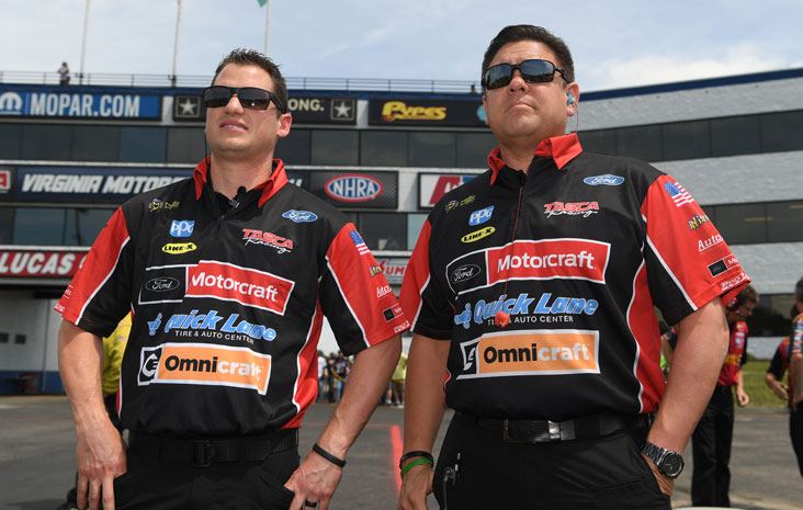 Jon Shaffer, left, is in his first event as co-crew chief on Bob Tasca III’s Motorcraft Ford Funny Car with incumbent tuner Eric Lane.