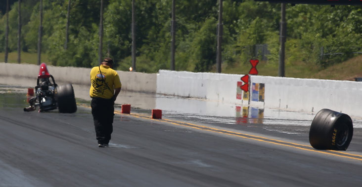 Super Comp racer Michele Costa lost a wheel while racing Sherman Adcock Jr. during the quarterfinals at the Virginia NHRA Nationals but safely came to a stop halfway down the dragstrip. [Video]
