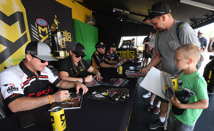 A quartet of reigning past NHRA Mello Yello champions –- Steve Torrence, Erica Enders, Rob Capps, and Andrew Hines -– met fans at the Mello Yello autograph session in the pits before the day’s opening qualifying session.