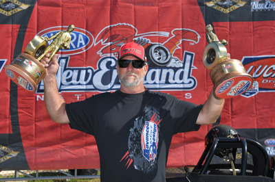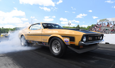 Funny Car racer Bob Tasca III isn’t the only Mustang driver from Rhode Island who’s enjoyed success lately. Dean Cook, who won the Stock title in Englishtown in 1983, collected his second win after driving his C/Stock ’71 Mustang to victory. Cook, who attributed his good fortune to a four-leaf clover he found at New England Dragway, defeated his son, Dean II, in the third round and later defeated Lenny Williams in a race decided by just .0007-second at the stripe. The final was also extremely close with just .007-second separating Cook from Angelo DiTocco, who was seeking his first national event win since 1998. DiTocco earned a spot in the final when he cooled off one of the hottest drivers in the sport, Joe Santangelo, who is ranked third in both Stock and Super Stock.
