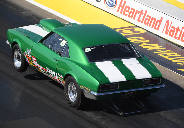 Recent National Dragster feature subject Tim Nicholson was racing in Super Gas with his unique Camaro, which is equipped with a Lenco transmission and a small block Chevy engine. Nicholson survived the opening round of eliminations.