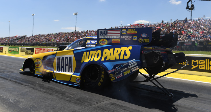 After running his special edition black NAPA Brakes body for the last few races, Ron Capps revered to his traditional blue and yellow NAPA Auto Parts colors for Topeka and qualified fifth-quickest with a 3.952.