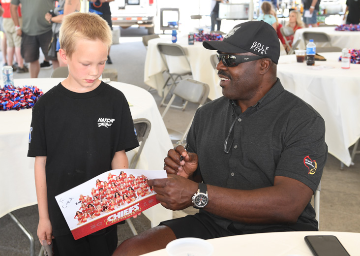Former NFL player Christian Okoye, a star running back for the Kansas City Chiefs from 1987 to 1992, was a special guest at Heartland Motorsports Park and spent time signing autographs for the fans.