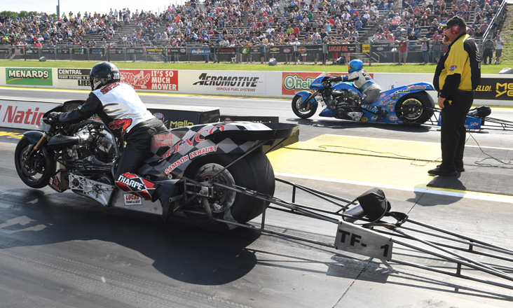 Reigning NHRA Top Fuel Harley series champ Tii Tharpe, near lane, earned his first win of the season with a final round victory over Bob Malloy, 6.313 to a slowing 7.391.