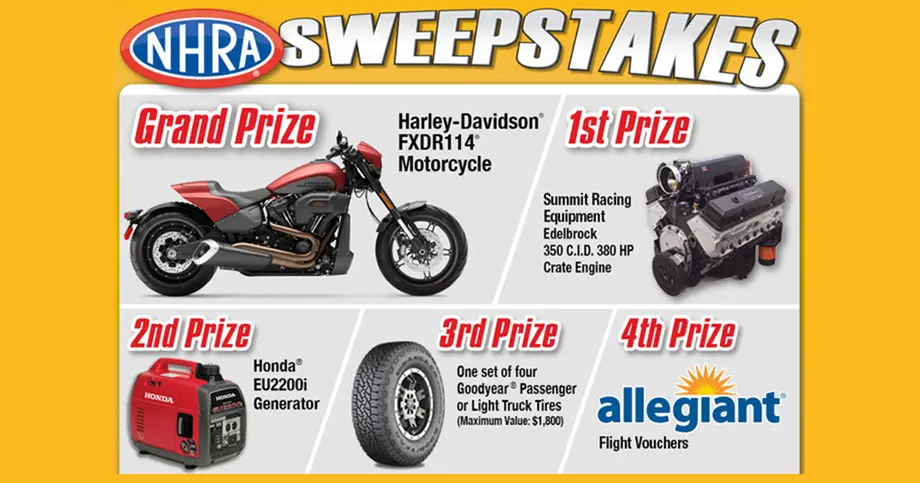 NHRA and its partners are proud to offer an opportunity for NHRA fans to enter for a chance to win the NHRA Sweepstakes. Winners will be selected after the contest ends at 11:59 p.m. Eastern on Dec. 31, 2019.