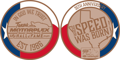 Fans who buy any adult ticket with pit pass for any day of the FallNationals will receive one Texas Motorplex 35th Anniversary Commemorative Coin to be redeemed at the Texas Motorplex souvenir stand during the FallNationals. This promotion is limited to one coin per household while supplies last.