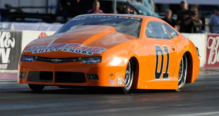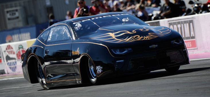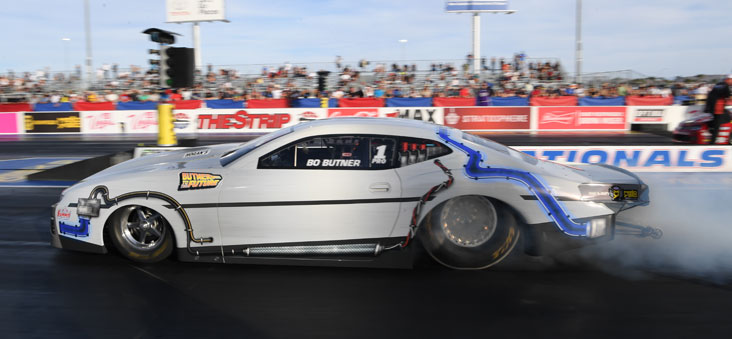 Bo Butner flying into Las Vegas Pro Stock action aboard 'Bo Force One' replicar
