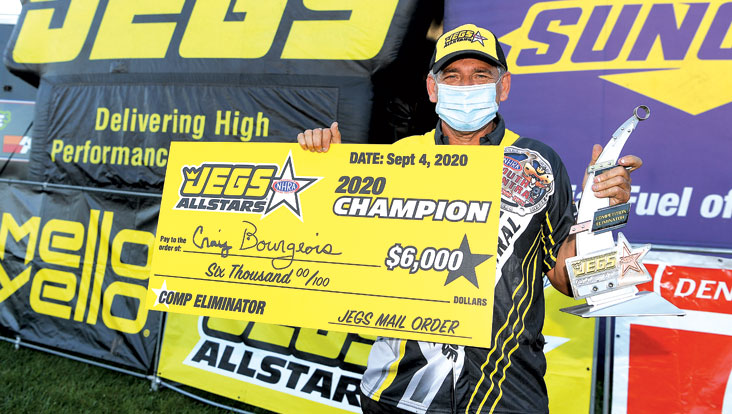 The spring of 2020 was not kind to Craig Bourgeois. After finishing second behind Frank Aragona Jr. in 2019, falling just short of winning what would have been his second NHRA Comp world championship, the Louisiana veteran opened his 2020 campaign in his home state with a devastating first-round loss the first week of March at the Division 4 NHRA Lucas Oil Drag Racing Series event at No Problem Raceway Park.