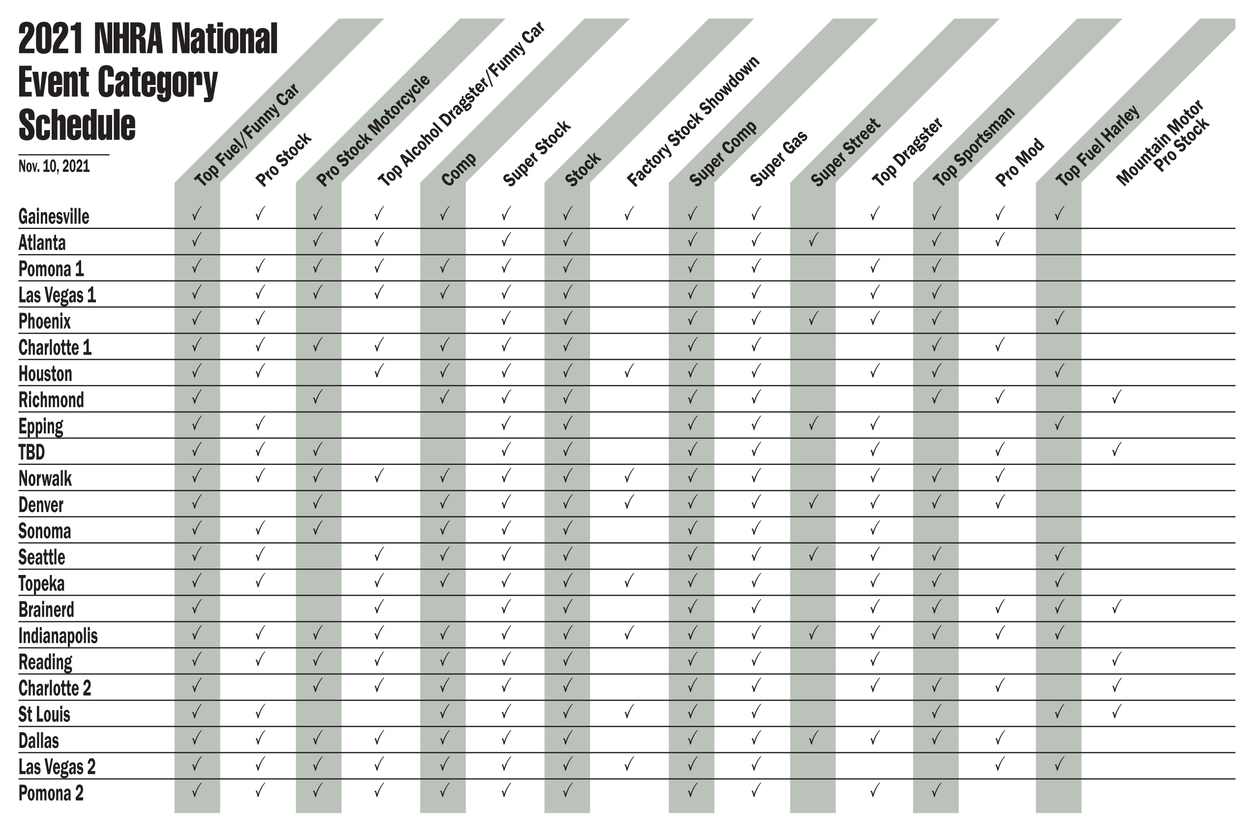 Competition Eliminator, Top Dragster presented by Vortech Supercharges, and Top Sportsman presented by Vortech Supercharges, will be contested at 18 NHRA Camping World National events in 2021.