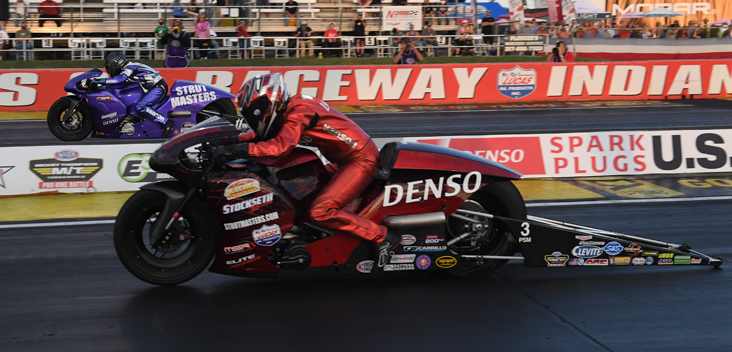 Although Pollacheck lost in the final, he certainly had a memorable day on Saturday at Indy. Riding his Strutmasters EBR, Pollacheck ran a 6.789 to qualify No. 1 for the second time in his career and he also locked up the fourth spot in the Denso 200-mph Pro Stock Motorcycle Club following a track record 200.26-mph run. A runner-up at the 2014 Pro Bike Battle, Pollacheck earned his spot in the final with wins against Steve Johnson and Eddie Krawiec.