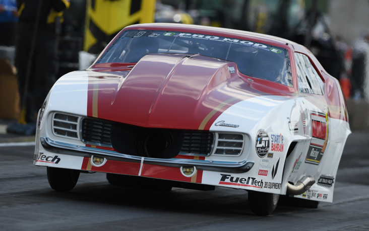 Given the unpredictable nature of Pro Mod cars, it’s hard to label almost any race as an upset, but that was an apt description for what happened when Justin Jones took out former Pro Mod champion Khalid alBalooshi in round one. Jones, making his first start in NHRA competition, grabbed a huge lead off the starting line and held on for a 5.92 to 5.85 holeshot win in a race that wasn’t as close as the numbers would indicate. alBalooshi had been the No. 1 qualifier with his Bahrain1Camaro, one of the first cars to debut the new ProCharger engine combination.