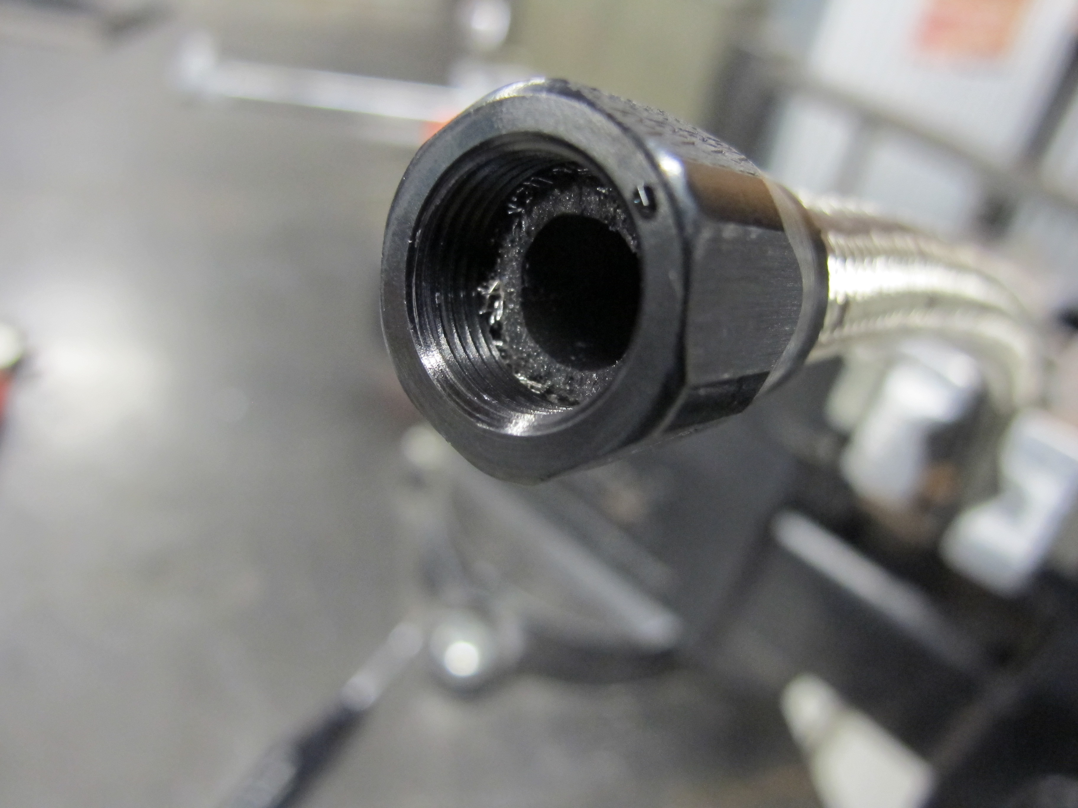 Step 2: Use diagonal cutters to trim any excess stainless-steel braid from the end of the hose. Use compressed air to blow contamination out of the line before installing the fitting.