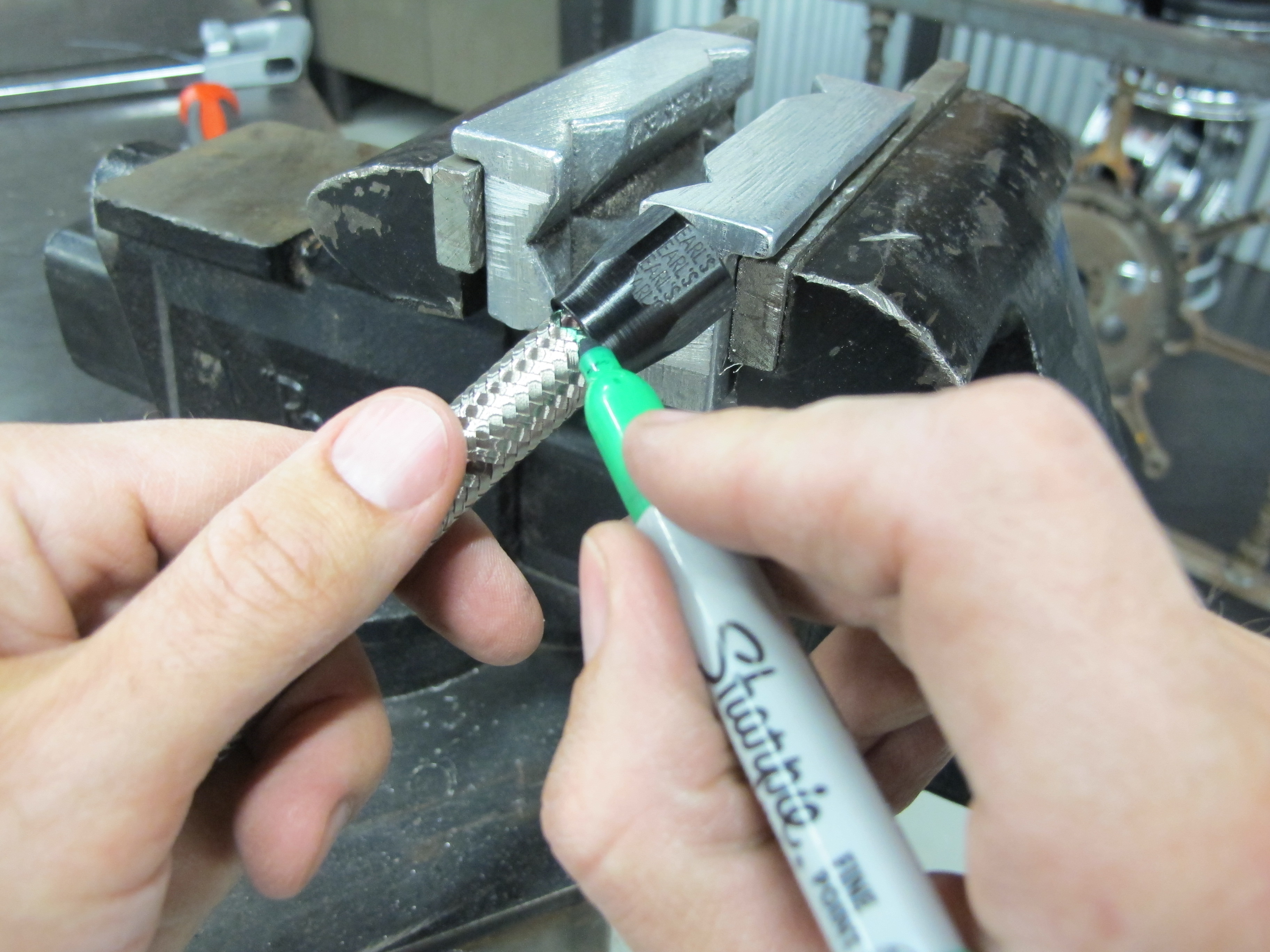 Step 1: A vise with soft jaws (XRP PN 821010), blue painter’s tape, and a hacksaw with at least 32-teeth per inch are required. Wrap the tape around the braided hose where you think the cut will need to be, measure and mark the actual location of the cut on the tape, and then cut the hose through the tape to keep the braid from fraying. Use the edge of the soft jaws to ensure the cut is straight and perpendicular to the hose end.