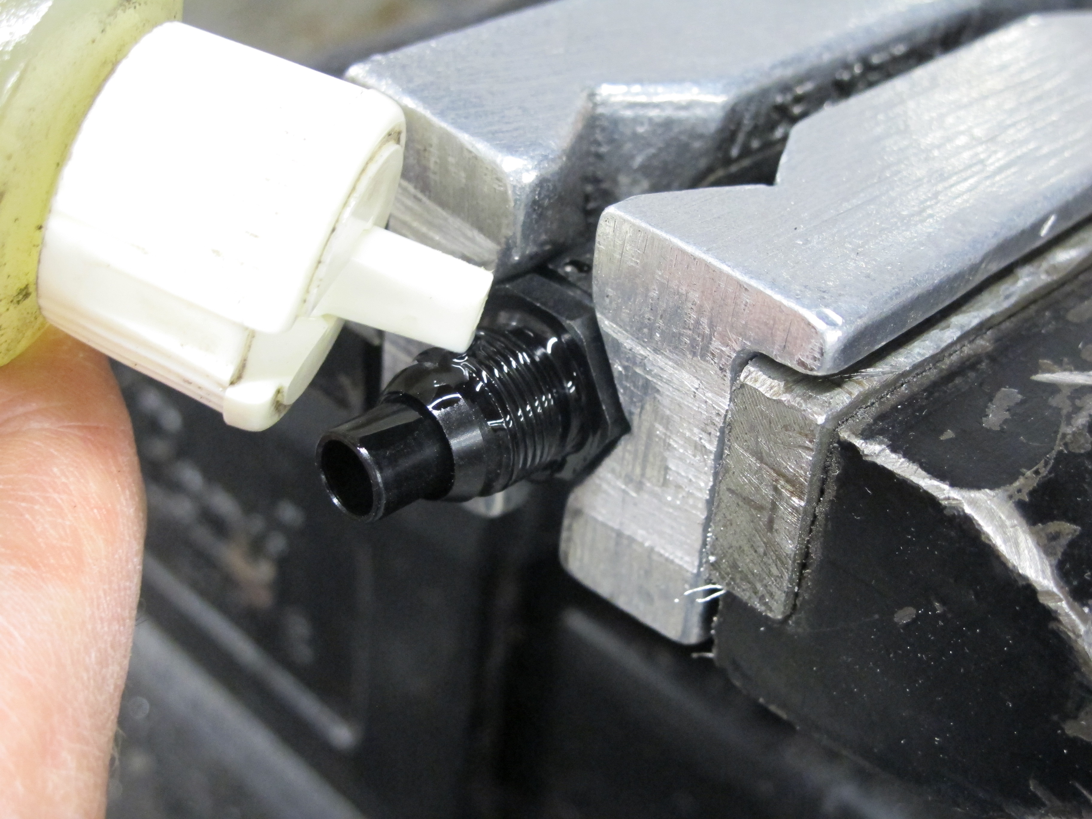Step 6: Install the cutter-side of the fitting into the soft jaws and lubricate the threads and male end of the fitting that goes into the hose. We used 3-in-1 oil here but antiseize also works.