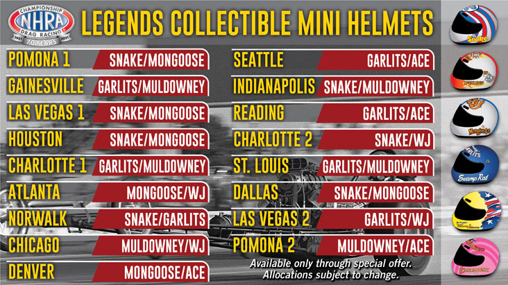 NHRA race fans who renew their tickets this season at select Mello Yello Drag Racing Series national events for 2021 will receive an NHRA Legend mini-helmet. The 2021 season will salute NHRA’s 70th anniversary and the events so now’s your chance to make sure you’re part of the celebration.