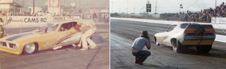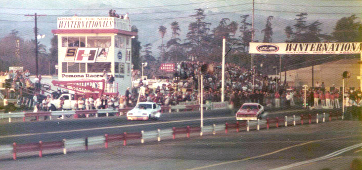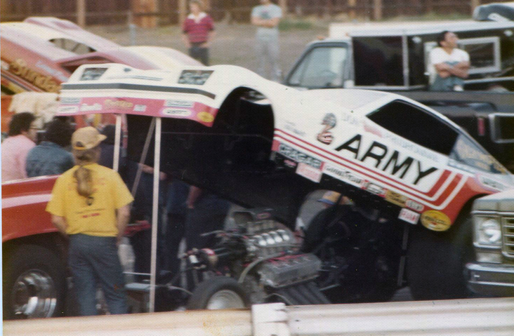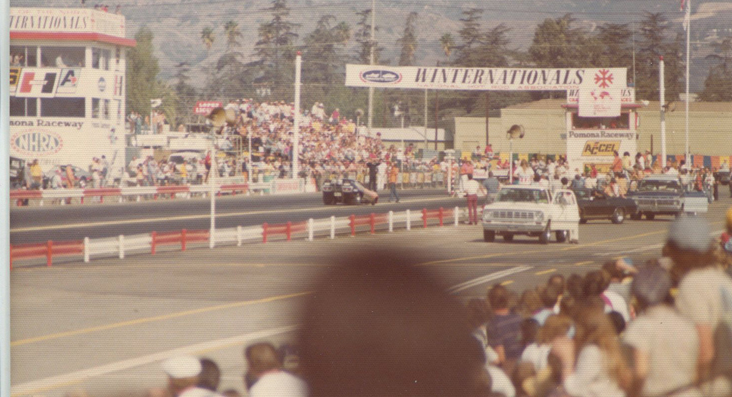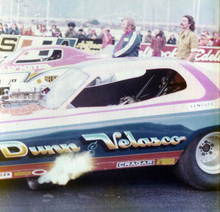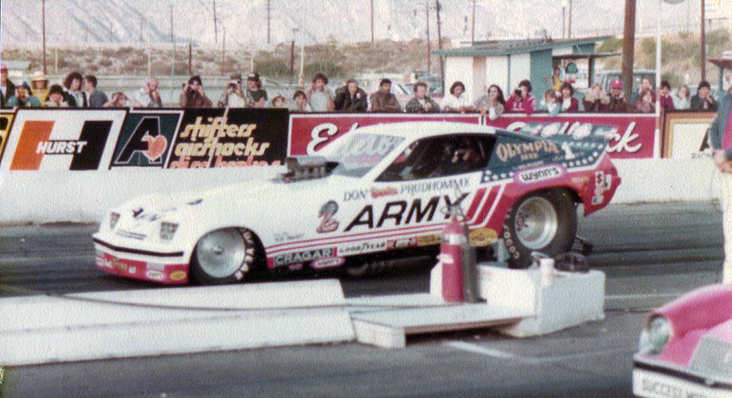 Prudhomme planned to retire the Monza at the end of 1976 at the Manufacturers Meet at Orange County Int’l Raceway (which he won, naturally). Part of the thrill of those great 1970s mega match races was the car line-up and fire-up on the track. Lousy photo, I know, but for posterity.