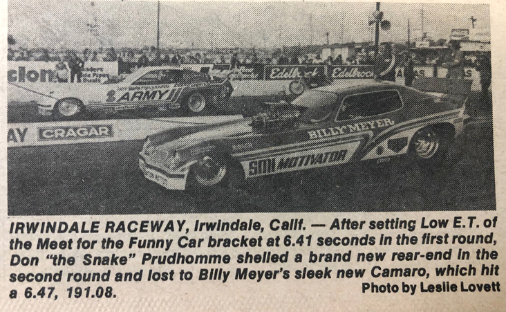 Anyway, remember how I said that Prudhomme planned to retire the car at OCIR (how could you forget? It was only 100 words ago). Anyway, he un-retired the car for the 1977 New Year’s Day Nitro Bowl event at Irwindale Raceway. Apparently his new Plymouth Arrow was not quite ready (but would win the Winternationals in a few weeks). He didn’t win the race (see below) but it was great to see the Monza one more time. What was even more cool was that I had starting line access (hence the better photo) because me and my buddy C. Van Tune were able to create some realistic photographer credentials (don’t try this today, kids; security is much tighter). When I snapped this photo of Prudhomme, he was getting ready to race Billy Meyer in round two (you can just see the nose of Meyer’s car as I was zoomed in on “the Snake”).