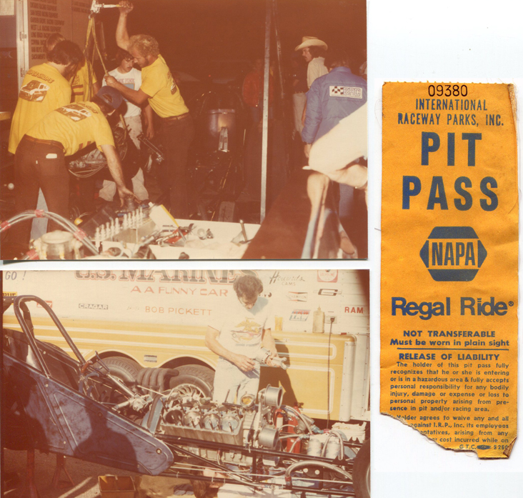 And finally, here’s some things you won’t see today. The veteranos out there know this but newcomers might not. Long before NHRA’s “Every Ticket is a Pit Pass” program, you actually had to buy a separate pass at the track if you wanted to go into the pits. You could low-dollar it by not forking over the extra $5, but who would do that? Plus you got to wear it on your jacket the next day at school! And, of course, it gave you ringside seats to the action, unlike today where you’re looking at the car from the back as its wedged between to trailers. Back in the (cue old-timer voice) good old days, you could stand right next to the crews and see up close and personal what was going on. That’s the Super Shops Funny Car team changing engines and Bob Pickett putting in new pistons. Both from the 1978 Manufacturers Meet at OCIR. Cool stuff!!