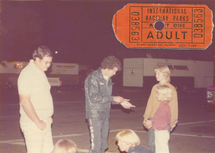 Long after he’d won the race (and there’s my nothing-fancy ticket stub), Prudhomme was signing autographs in the pits when I stumbled across him. Those kids are in the 50s now. Are you one of them?