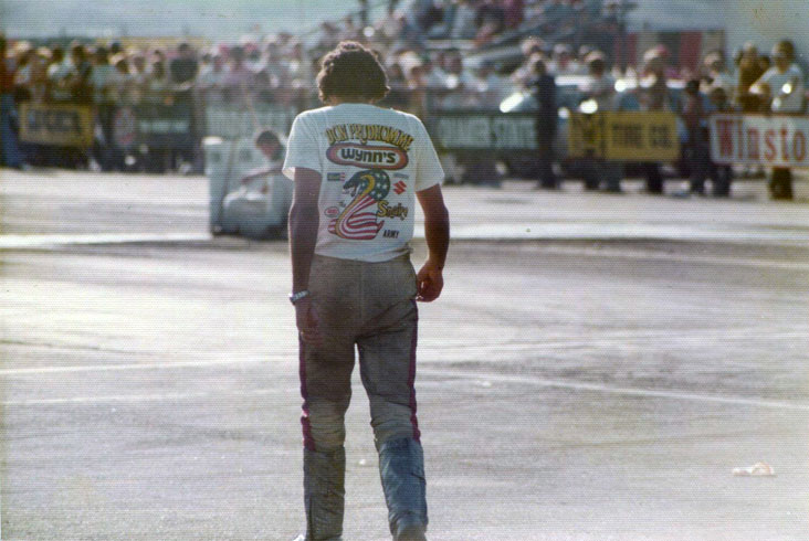 Man, I have always loved this photo I took of Prudhomme walking out to the Pomona starting line to check out the conditions prior to one of the rounds. I snuck to the head of the staging lane to grab it. I can just picture the lope in his walk, the cigarette dangling in his right hand, the dirty firepants, the t-shirt. Classic stuff.