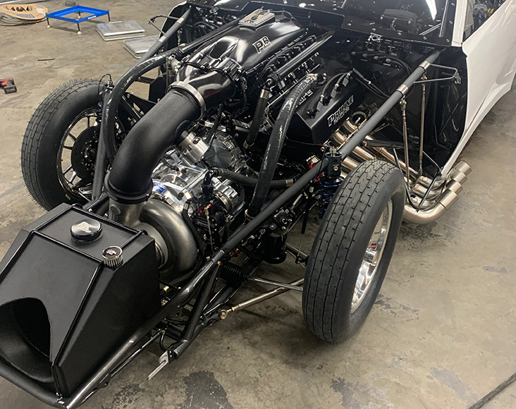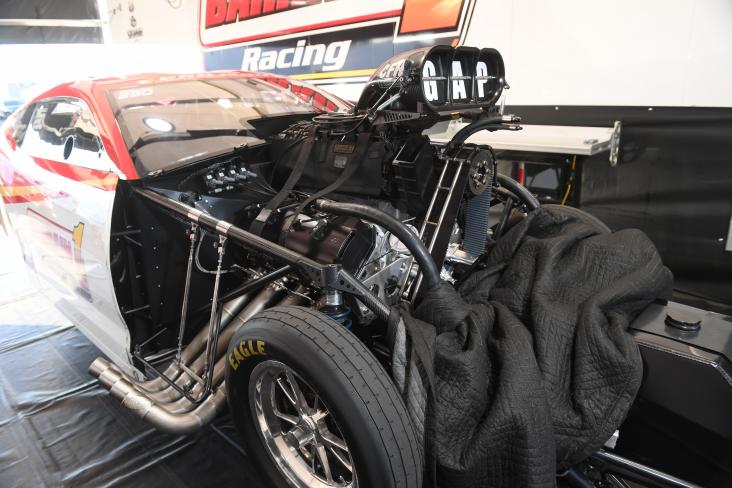 The newest approved power adder in NHRA Pro Mod competition is just as discreet as the turbo power adder it shares some similarities with. This is a supercharger but it hides under the hood like a turbo and uses a compressor wheel to force air into the engine. That's where the similarities end; centrifugal superchargers are belt driven (not exhaust-driven, like turbos) and also require a 2,600-pound minimum weight. Spot them by looking for the four header primaries (zoomies) poking out of either side of the car, much like a standard supercharged vehicle.