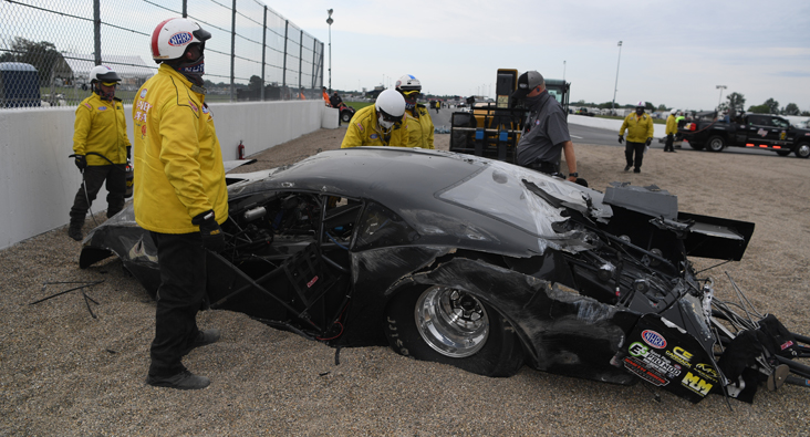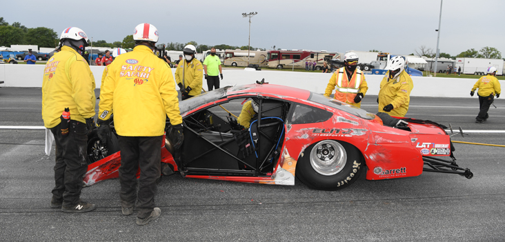 Two accidents 40 minutes apart marred the first round of Pro Mod eliminations, which ultimately was halted by a rainshower with two pairs remaining (and finished two hours and 20 minutes later).