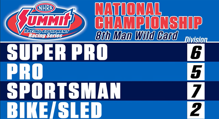 Recently, NHRA announcers Brian Lohnes and Alan Reinhart hosted an online drawing to determine the wild card positions for the 2020 Summit E.T. Racing Series Finals, and the winners are Division 6 (Super Pro), Division 5 (Pro E.T.), Division 7 (Sportsman), and Division 2 (Super Pro Bike/Sled). Each division uses its own method to select the wild card winner although it is often the Race of Champions winner.