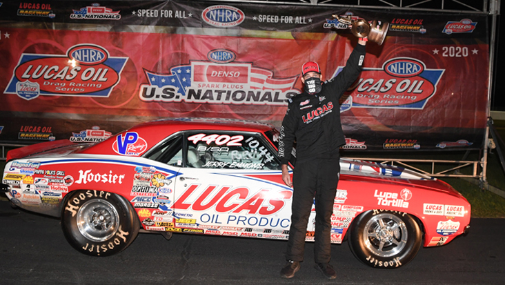The Emmons brothers -- identical triplets Gary, Terry, and Jerry, along with their older brother, Harvey III -- have done a lot of damage in Super Stock and Stock over the last three decades but few of their wins will compare to the 2020 Denso NHRA U.S. Nationals where Jerry claimed the Super Stock title and Terry scored his second win in Stock Eliminator. It was the third time the Emmons brothers have doubled at an event, but the first at Indy. Terry and Harvey first accomplished the feat at the 1999 Memphis race and Jerry and Gary combined for a Super Stock and Stock double in Dallas in 2011. At Indy, Jerry won his 16th national event title and second Indy when he topped Parker DeVore in the Stock final. A few minutes later, Terry scored career win No. 7 when he drove his Protect the Harvest entry past Dan Fletcher, who was in pursuit of his 105th national event title.