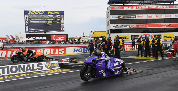 Bob Malloy’s quest to win the Mickey Thompson Top Fuel Harley class at Indy came to an end when he broke in his semifinal race against Jay Turner, but his performance a round earlier made headlines throughout the sport. Seemingly out of nowhere, Malloy powered to a 6.096-second run in his opening round win against Ryan Peery. It was the quickest run in the history of the class, eclipsing Tak Shigematsu’s record of 6.101 from the 2019 Amalie Motor Oil Gatornationals.
