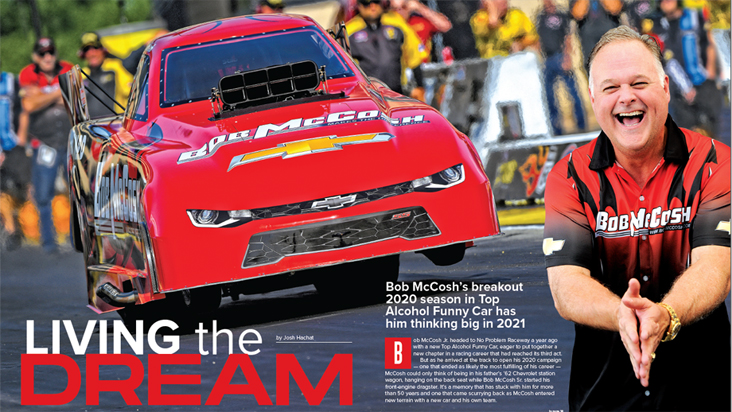 It was just the start of a stellar season for McCosh, who owns Bob McCosh Chevrolet Buick GMC Cadillac in Columbia, Mo. He surprisingly finished fourth in the world championship points, reveling in the new opportunity to run a team. In what was a challenging year for many, McCosh included, because of the COVID-19 pandemic, he thrived on the track, winning a race and advancing to four final rounds, including that opening race in Belle Rose and the season finale at the NHRA national event in Las Vegas.