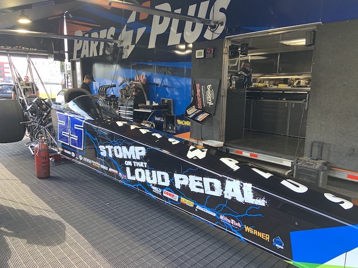 Team owner Doug Stringer surprised Millican on Friday at Bristol Dragway with a special wrap dedicated to Millican’s late son, Dalton, who passed away in 2015. It’s a nod to the “Blue Thunder” monster truck that Dalton drove with blue lightning bolts along the side of the dragster and his No. 25 near the cockpit.