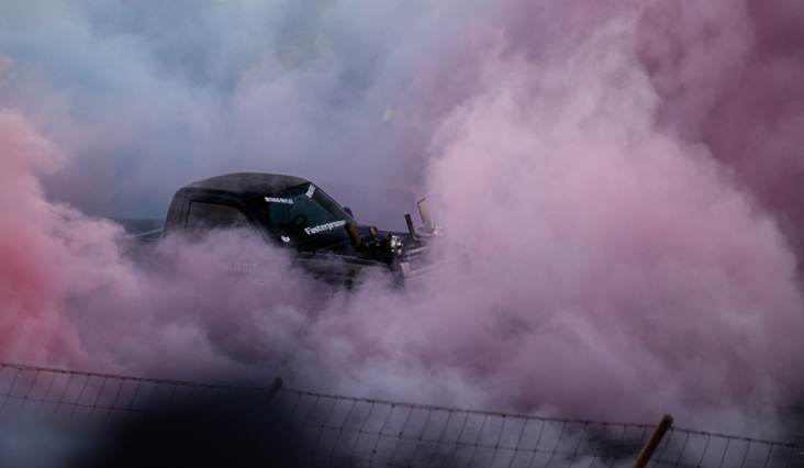 The burnout competition is easily the highlight of the event, at least when one considers the fan reaction. Held on the front stretch of Lucas Oil Raceway’s .686-mile oval track, the rules for the burnout competition are fairly simple: keep the car moving and try not to hit anything. McFarland shows the competitors how it’s done, kicking off the show with his highly modified Grand Marque Police Interceptor. Throttle foot planted firmly to the floorboard, he sends up a huge cloud of tire smoke while melting a set of tires down to the cords.