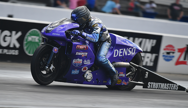 Reaction times were the name of the game in the second round of Pro Stock Motorcycle where Angelle Sampey beat Andrew Hines on a 6.907 to 6.901 holeshot (.022 to .051 RTs), Scotty Pollacheck went .000 perfect but couldn’t hold off Steve Johnson, and Matt Smith left .004-second too soon and red-lighted against Eddie Krawiec.