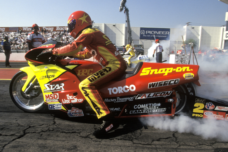 The great former Pro Stock Motorcycle champ John Myers won 33 of the 103 races he entered for a 32% victory ratio, and another past champ, Matt Hines, racked up a 31.2% total, winning 30 of the 96 races he entered.