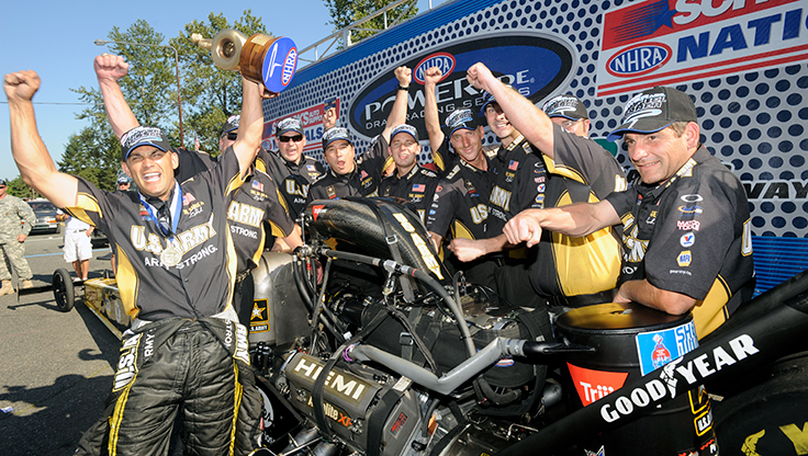 Pro Stock's Allen Johnson also was bidding for a sweep at the 2012 event after winning in Denver and Sonoma but was felled in the Seattle semi's by Erica Enders. Johnson’s amazing run of success in Denver also likely prevented Vincent Nobile in 2013 and Jason Line in 2014 from possible sweeps as both won in Sonoma and Seattle after A.J. had won in Denver. Chris McGaha also won in Sonoma and Seattle in 2015 after seeing Larry Morgan upset Johnson in the Denver final.