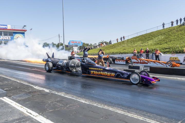 Although Perdue had the quickest quarter-mile time of the event at 5.347 seconds, Rosberg won the feature while pushing his American Thunder entry to top speed of the meet at 290.82 mph. Defending champion Barry Nall, of Eagle Springs, N.C., was ousted in the third round of the Combo bracket event in which Top E.T. and Footbrake cars ran separately until only eight drivers remained in competition.