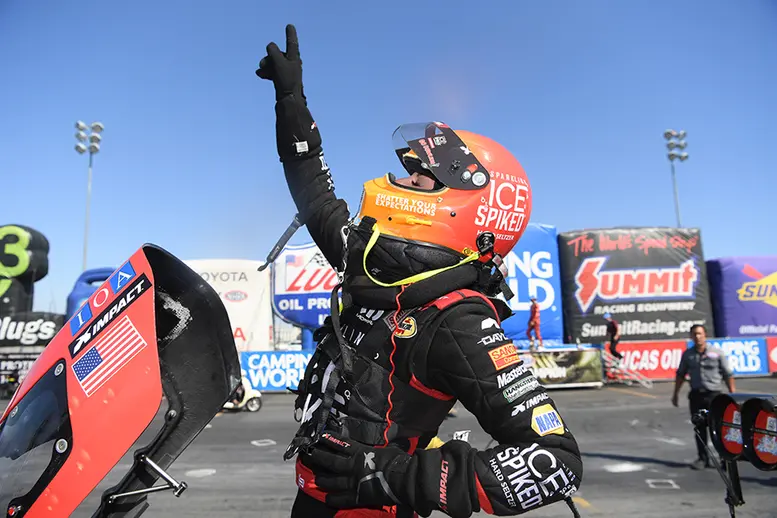 Leah Pruett, who began her racing career in Jr. Dragsters at Auto Club Raceway at Pomona, scored a morale-boosting first win of the season and her second at the fabled Winternationals after opponent Justin Ashley was unable to run the final round due to heat-related issues. Pruett made a single run of 4.021 in her Sparkling Ice Spiked dragster after Ashley was pulled from his car prior to start up.