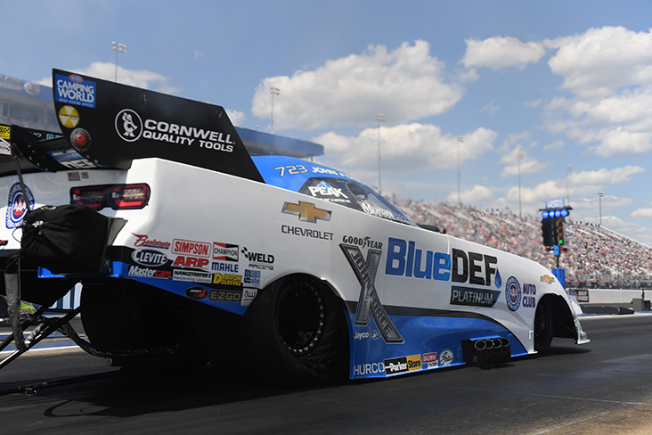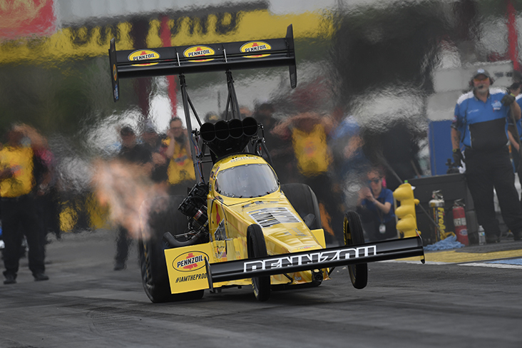 Following an abbreviated one-shot day of qualifying on Saturday, it didn’t take long for Top Fuel to get serious as the first pair of eliminations featured a rematch of the Gatornationals final between rookie Josh Hart and world champion Shawn Langdon. The match ended early when Hart smoked the tires and backfired a supercharger right off the starting line, sending Langdon on to the win with a 3.803.